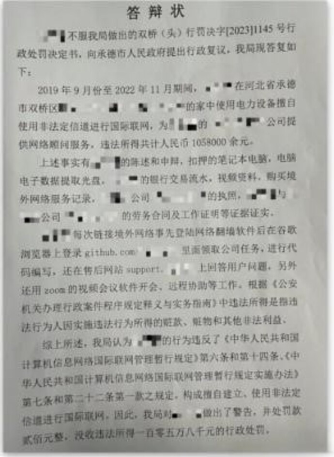2023年9月24日,一位微博用戶聲稱自己因為使用翻墻技術(shù)在GitHub上工作而被河北承德公安局雙橋分局處以上百萬元的罰款。根據(jù)其答辯狀,這名男子在2019年至2022年期間涉嫌在GitHub上接受公司任務(wù)、編寫代碼,回答用戶問題,并使用Zoom進(jìn)行遠(yuǎn)程辦公。根據(jù)相關(guān)處罰規(guī)定,由于上述行為被視為違法,他被罰款200元,并沒收1058000元的違法所得。該程序員稱,國慶之后會在當(dāng)?shù)靥崞鹦姓V訟,并在網(wǎng)絡(luò)上尋求律師的幫助。