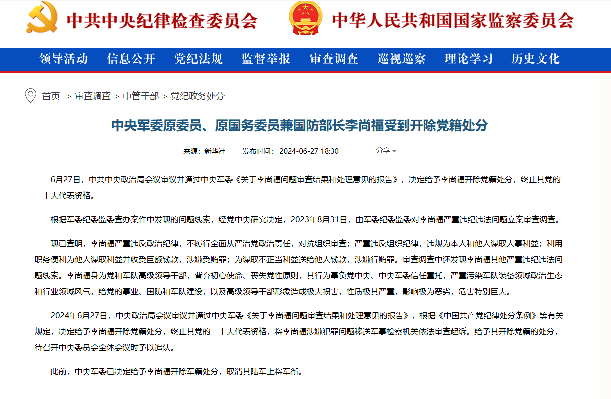 閱讀更多...6月27日,中共中央政治局會議審議并通過中央軍委《關于李尚福問題審查結果和處理意見的報告》,決定給予李尚福開除黨籍處分,終止其黨的二十大代表資格。