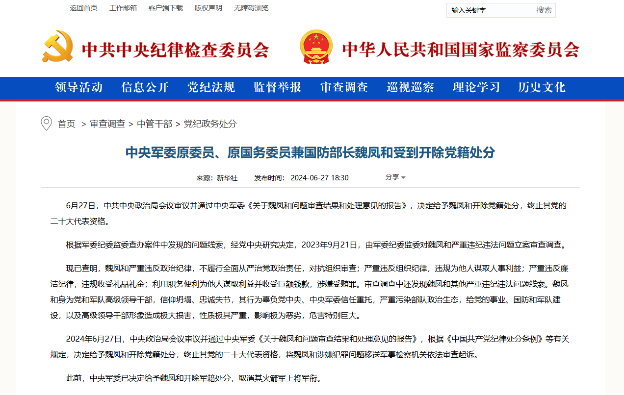 閱讀更多...6月27日,中共中央政治局會議審議并通過中央軍委《關于魏鳳和問題審查結果和處理意見的報告》,決定給予魏鳳和開除黨籍處分,終止其黨的二十大代表資格。