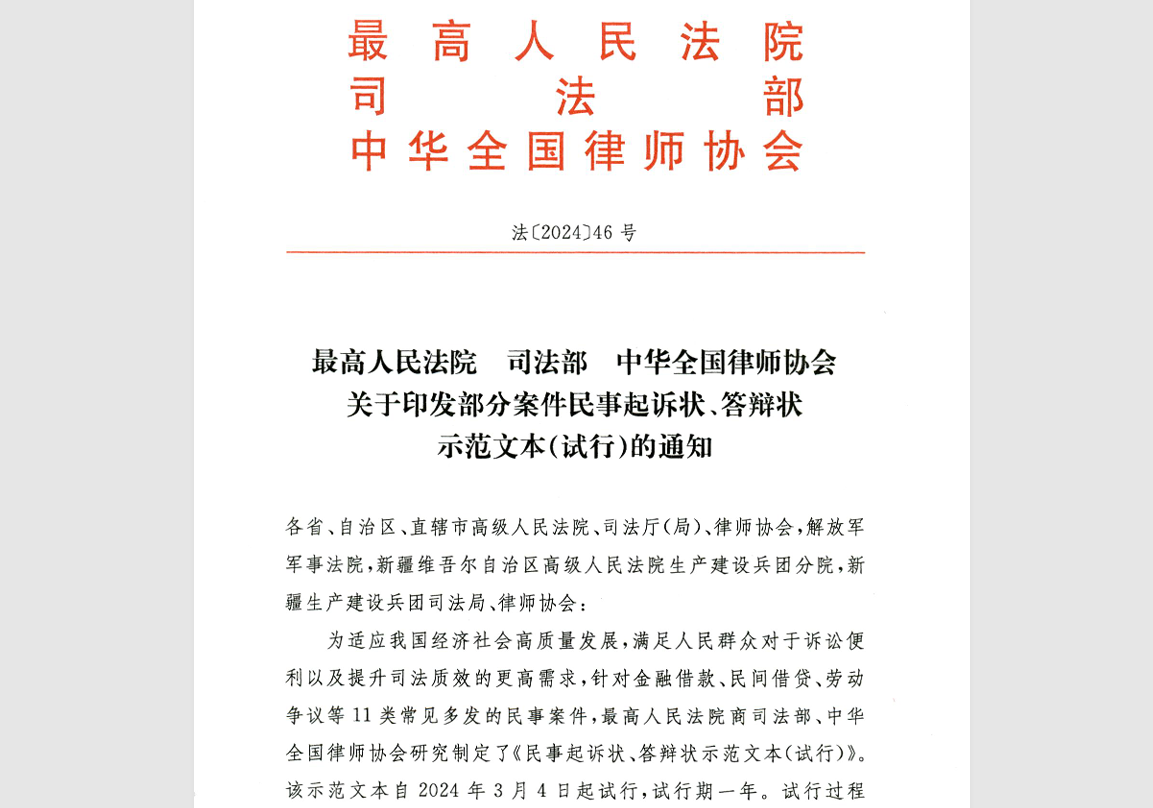 閱讀更多...為適應我國經濟社會高質量發(fā)展,滿足人民群眾對于訴訟便利以及提升司法質效的更高需求,針對金融借款、民間借貸、勞動爭議等11類常見多發(fā)的民事案件,最高人民法院商司法部、中華全國律師協(xié)會研究制定了《民事起訴狀、答辯狀示范文本(試行)》。 該示范文本自2024年3月4日起試行,試行期一年。試行過程中,請注意以下問題: 一、充分認識發(fā)布民事起訴狀、答辯狀示范文本的重要意義,做好應用及宣傳工作 制作起訴狀、答辯狀是當事人參與訴訟程序的第一道關口,也是實現(xiàn)庭審優(yōu)質化的前端要件,直接關系到人民群眾訴訟權利的保障和實現(xiàn),關系到人民法院解決糾紛的質量和效率。此次發(fā)布的起訴狀、答辯狀示范文本,堅持問題導向,針對常見多發(fā)的民事糾紛類型,為當事人起訴、答辯提供規(guī)范全面的訴訟指引,方便人民群眾聚焦訴訟請求 ...